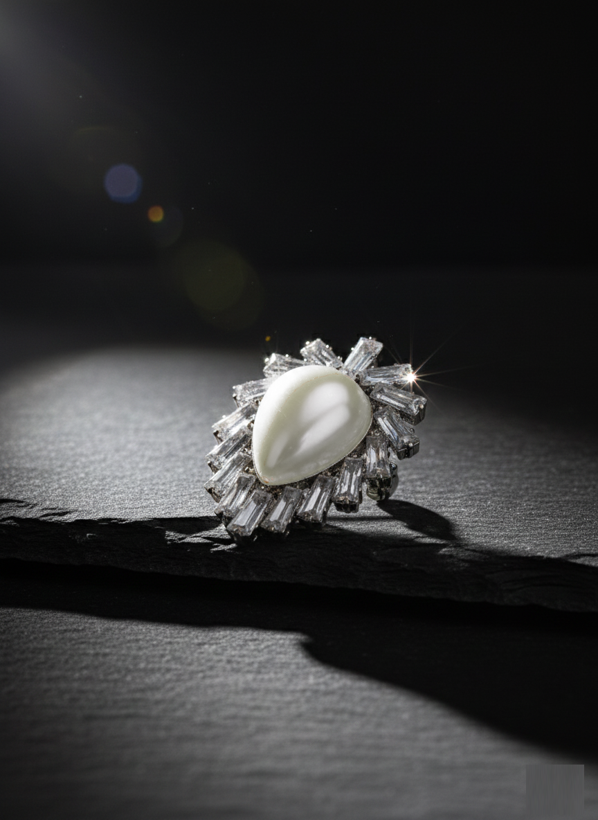 Dramatic Sunburst Design: A magnificent teardrop-shaped faux pearl is framed by a striking sunburst or fringe of dazzling Baguette-Cut Cubic Zirconia (CZ) stones.