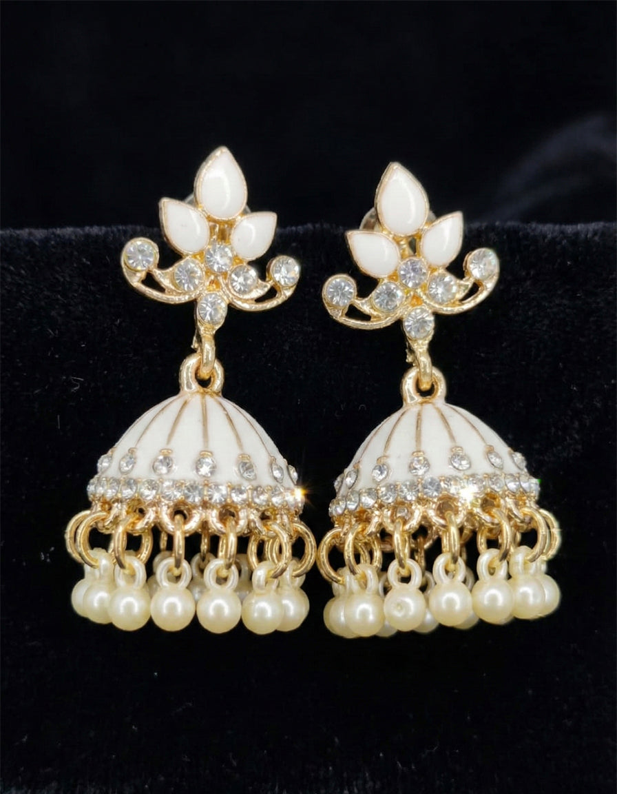 These exquisite earrings are the perfect choice for making an understated yet glamorous statement on the ears. Their combination of bright enamel and luminous pearls ensures they catch light from every angle, making them a spectacular piece for any occasion. Furthermore, the secure post-back closure ensures a comfortable and safe fit. Therefore, the Ornate Pearl-Drop White Jhumkas are an essential piece for a collection dedicated to extraordinary brilliance and enduring classic style.